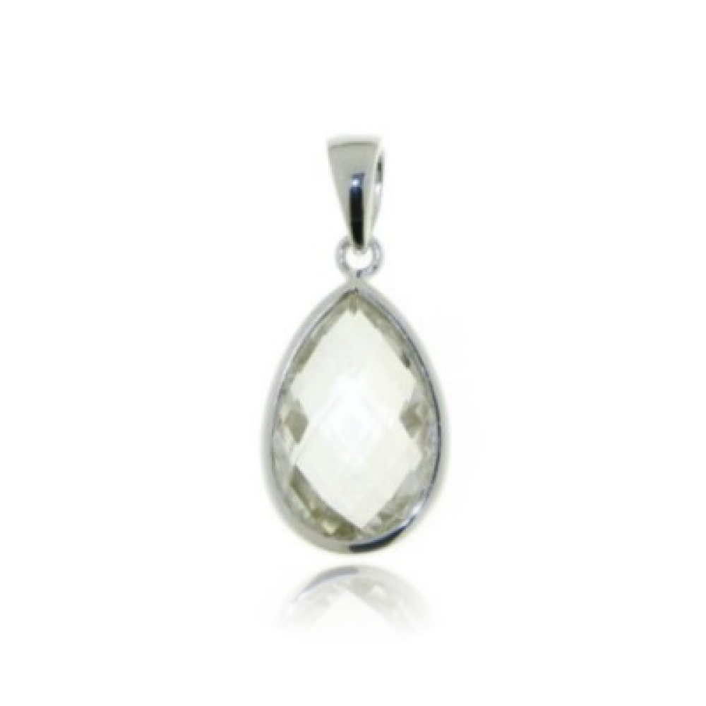 De zilveren hanger heeft een facet geslepen edelsteen. De vorm van de edelsteen is druppelvormig met een afmeting van 16 bij 10 mm.