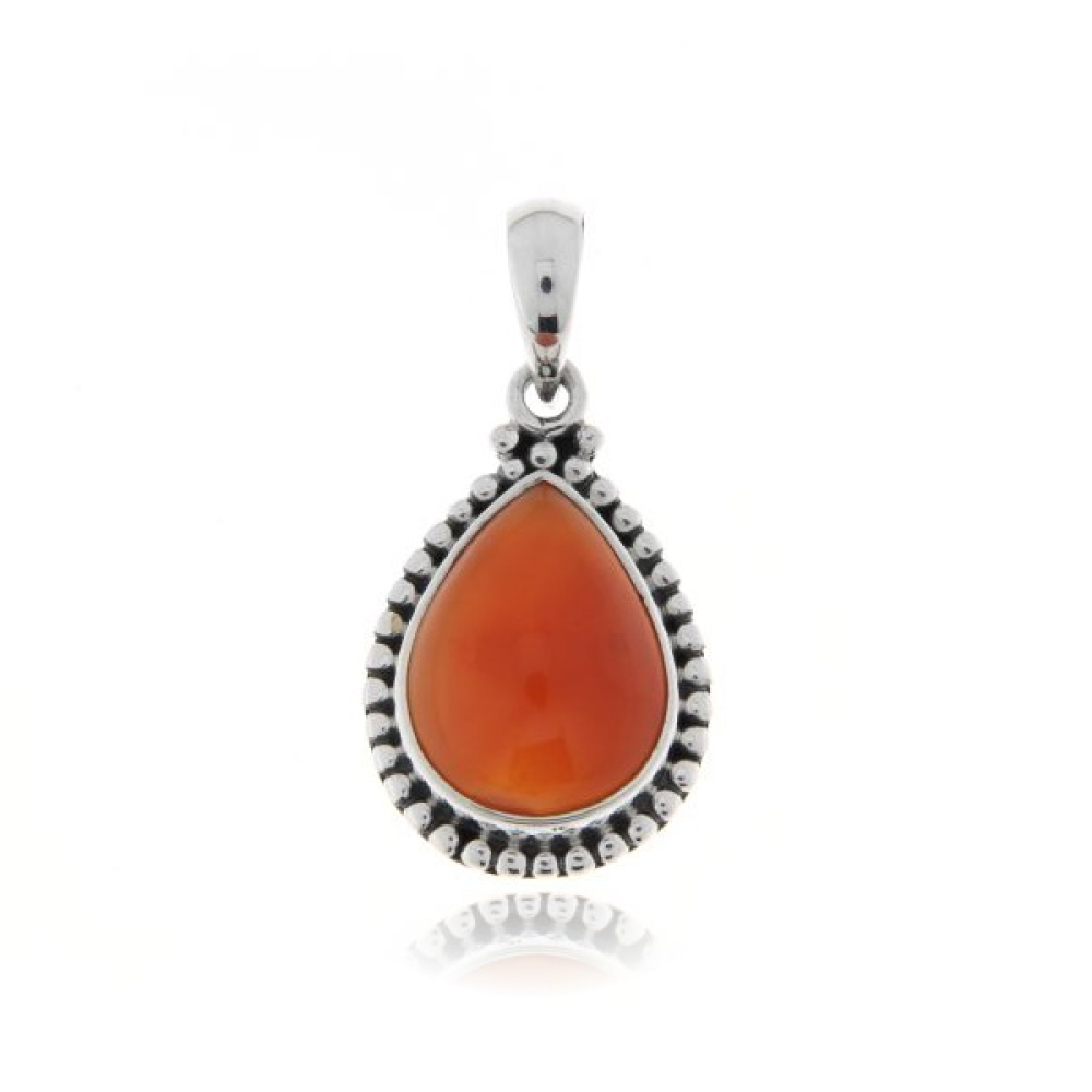 De zilveren hanger heeft een cabouchon geslepen edelsteen. De vorm van de edelsteen is druppelvormig met een afmeting van 16 bij 12 mm.