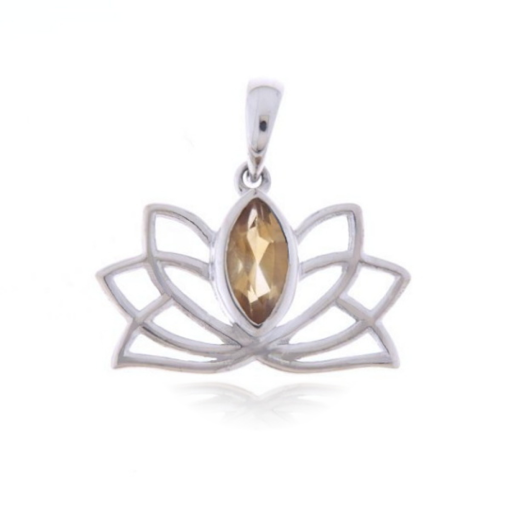 De zilveren lotusbloem hanger heeft een facet geslepen edelsteen. De vorm van de edelsteen is marquise vormig met een afmeting van 10 x 5 mm. In het Boeddhisme is de Lotus het symbool voor het inzicht dat tot verlichting leidt.