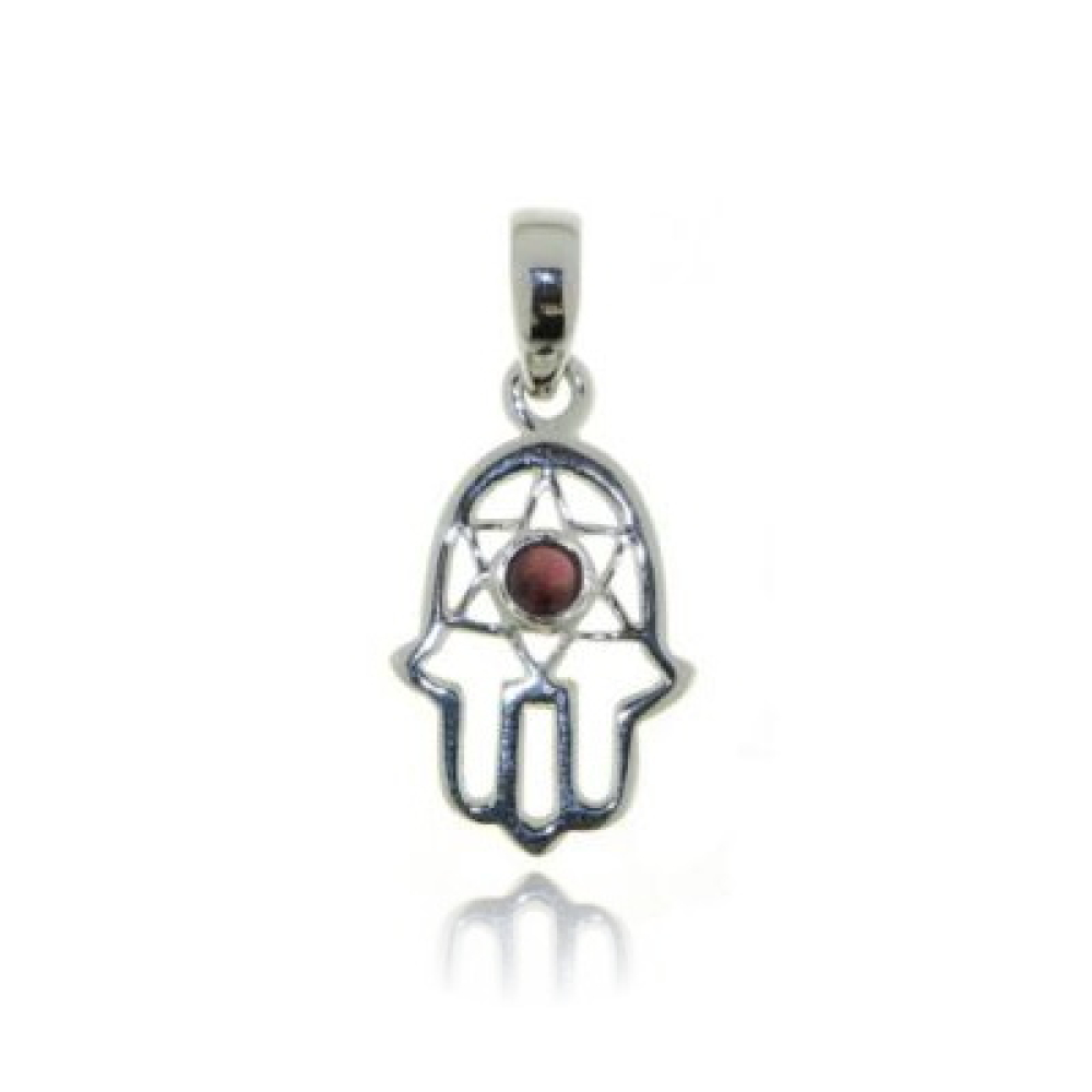 De zilveren hanger met het fatima handje heeft een cabouchon geslepen edelsteen. De vorm van de edelsteen is rond met een afmeting van 3 mm. Het handje van Fatima of wel Hamsa handje komt van oudsher uit het Midden-Oosten. Dit symbool staat voor de hand van Fatima Zahra, de meest favoriete dochter van de profeet Mohammed. Het is het symbool van de hand van God en is een beschermend amulet. Hamsa staat voor het getal 5 in het Arabisch en Hebreeuws en symboliseert de meest heilige principes van die cultuur. De Hamsa hand brengt de eigenaar geluk, goedheid, overvloed, vruchtbaarheid en een goede gezondheid. Het symbool staat voor geluk en persoonlijke bescherming.