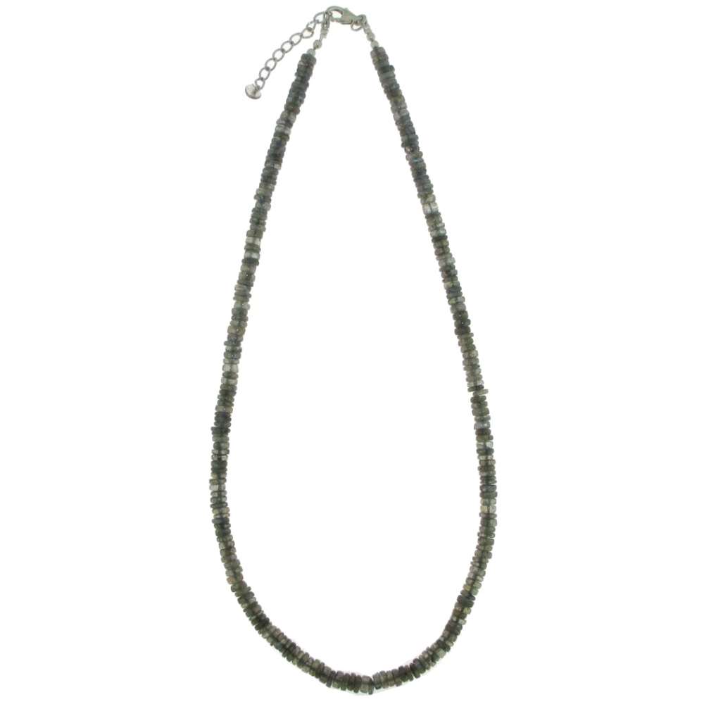Het collier heeft cabouchon rond geslepen edelstenen. Het collier heeft een lengte van 44 cm met een verlengstuk van 4 cm.