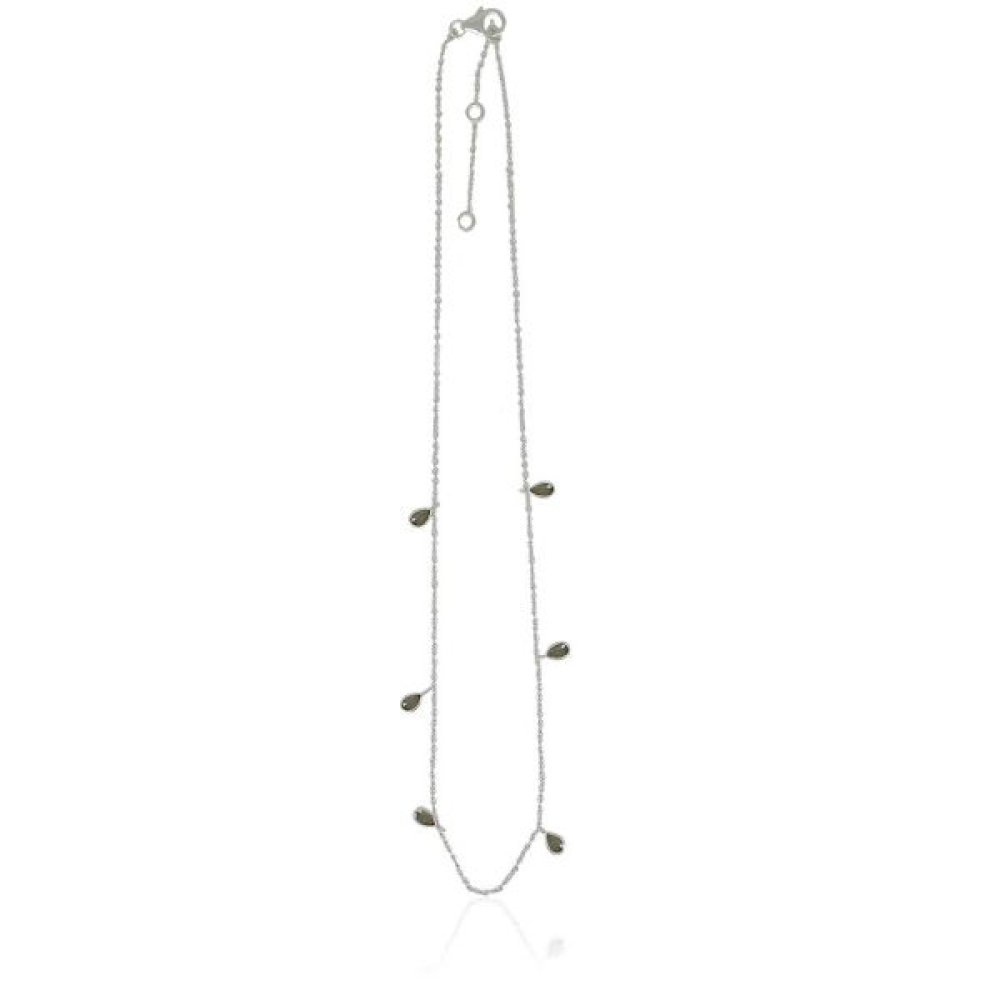 Het zilveren collier heeft facet geslepen edelstenen. De edelstenen zijn druppelvormig en hebben een afmeting 5 x 3 mm. De lengte van het collier is 40 cm en kan verlengd worden tot 42 of 45 cm.