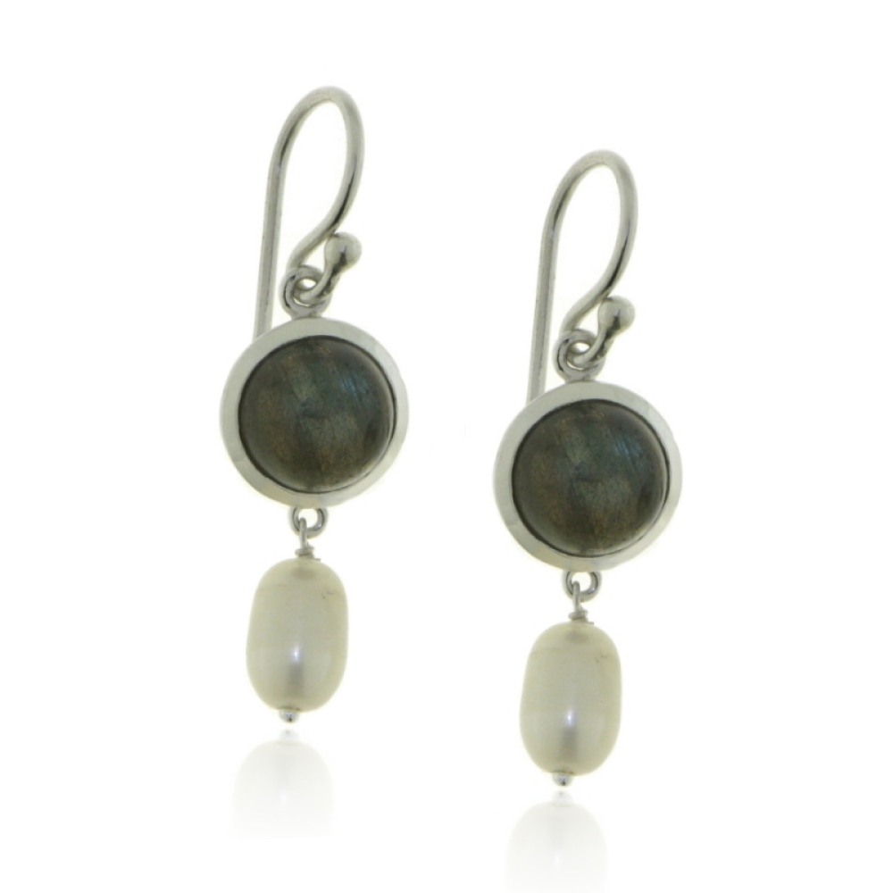 De zilveren oorhanger heeft cabouchon geslepen edelstenen. De edelsteen is rond met een afmeting van 8 mm met daaronder een zoetwater parel.