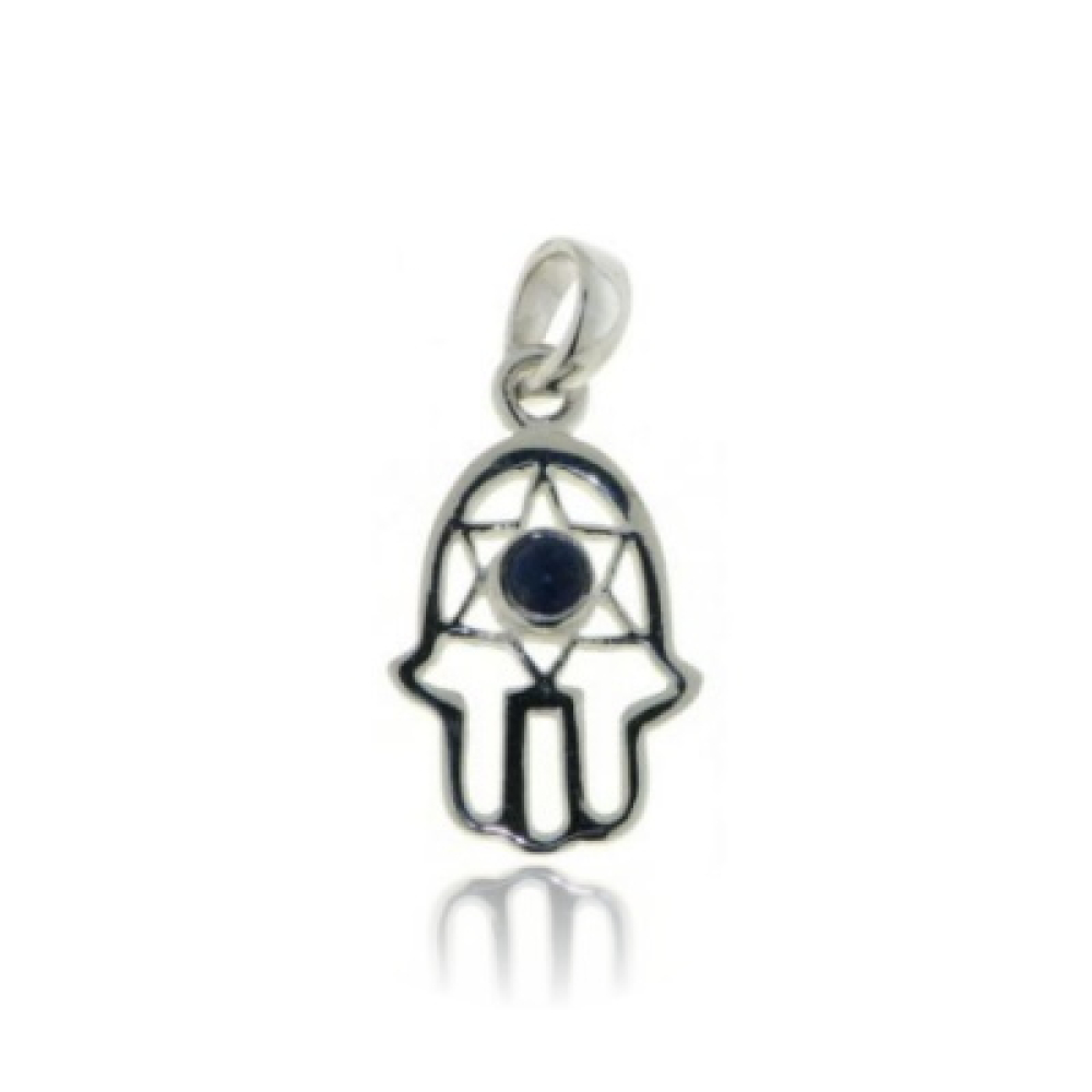 De zilveren hanger met het fatima handje heeft een cabouchon geslepen edelsteen. De vorm van de edelsteen is rond met een afmeting van 3 mm. Het handje van Fatima of wel Hamsa handje komt van oudsher uit het Midden-Oosten. Dit symbool staat voor de hand van Fatima Zahra, de meest favoriete dochter van de profeet Mohammed. Het is het symbool van de hand van God en is een beschermend amulet. Hamsa staat voor het getal 5 in het Arabisch en Hebreeuws en symboliseert de meest heilige principes van die cultuur. De Hamsa hand brengt de eigenaar geluk, goedheid, overvloed, vruchtbaarheid en een goede gezondheid. Het symbool staat voor geluk en persoonlijke bescherming.