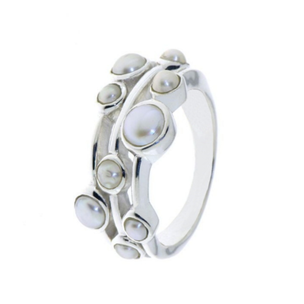 De zilveren ring heeft facet geslepen edelstenen. De vorm van de edelstenen zijn rond met verschillende afmeting.