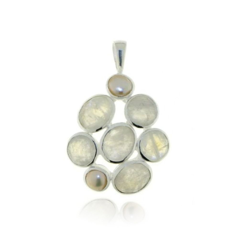 De zilveren hanger heeft facet geslepen edelstenen in combinatie met parels.