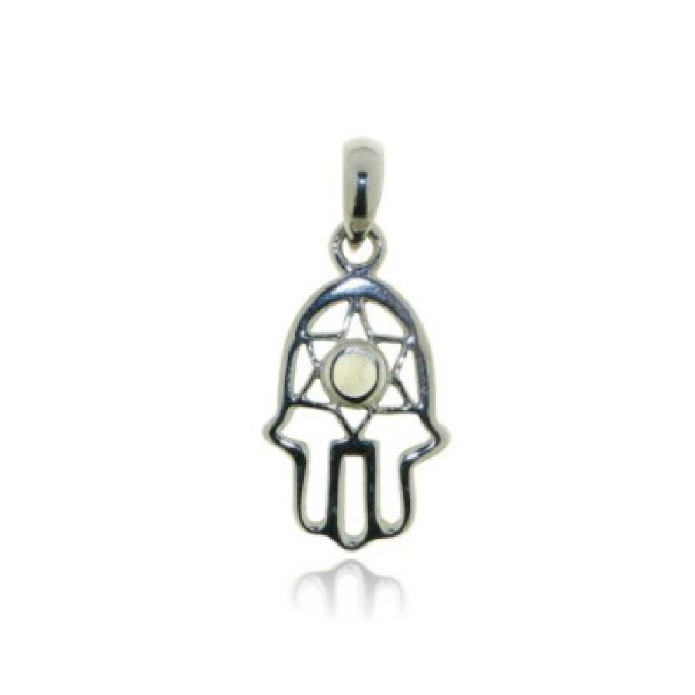 De zilveren hanger met het fatima handje heeft een cabouchon geslepen edelsteen. De vorm van de edelsteen is rond met een afmeting van 3 mm. Het handje van Fatima of wel Hamsa handje komt van oudsher uit het Midden-Oosten. Dit symbool staat voor de hand van Fatima Zahra, de meest favoriete dochter van de profeet Mohammed. Het is het symbool van de hand van God en is een beschermend amulet. Hamsa staat voor het getal 5 in het Arabisch en Hebreeuws en symboliseert de meest heilige principes van die cultuur. De Hamsa hand brengt de eigenaar geluk, goedheid, overvloed, vruchtbaarheid en een goede gezondheid. Het symbool staat voor geluk en persoonlijke bescherming.