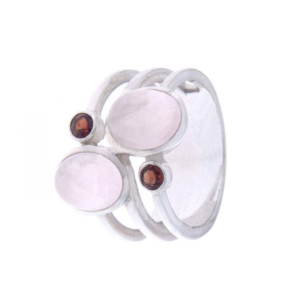 De zilveren ring heeft zowel cabouchon als facet geslepen edelstenen. De vorm van de cabouchon geslepen edelstenen zijn ovaal met een afmeting van 10 x 8 mm en de ronde facet geslepen edelsteen zijn 4 mm.