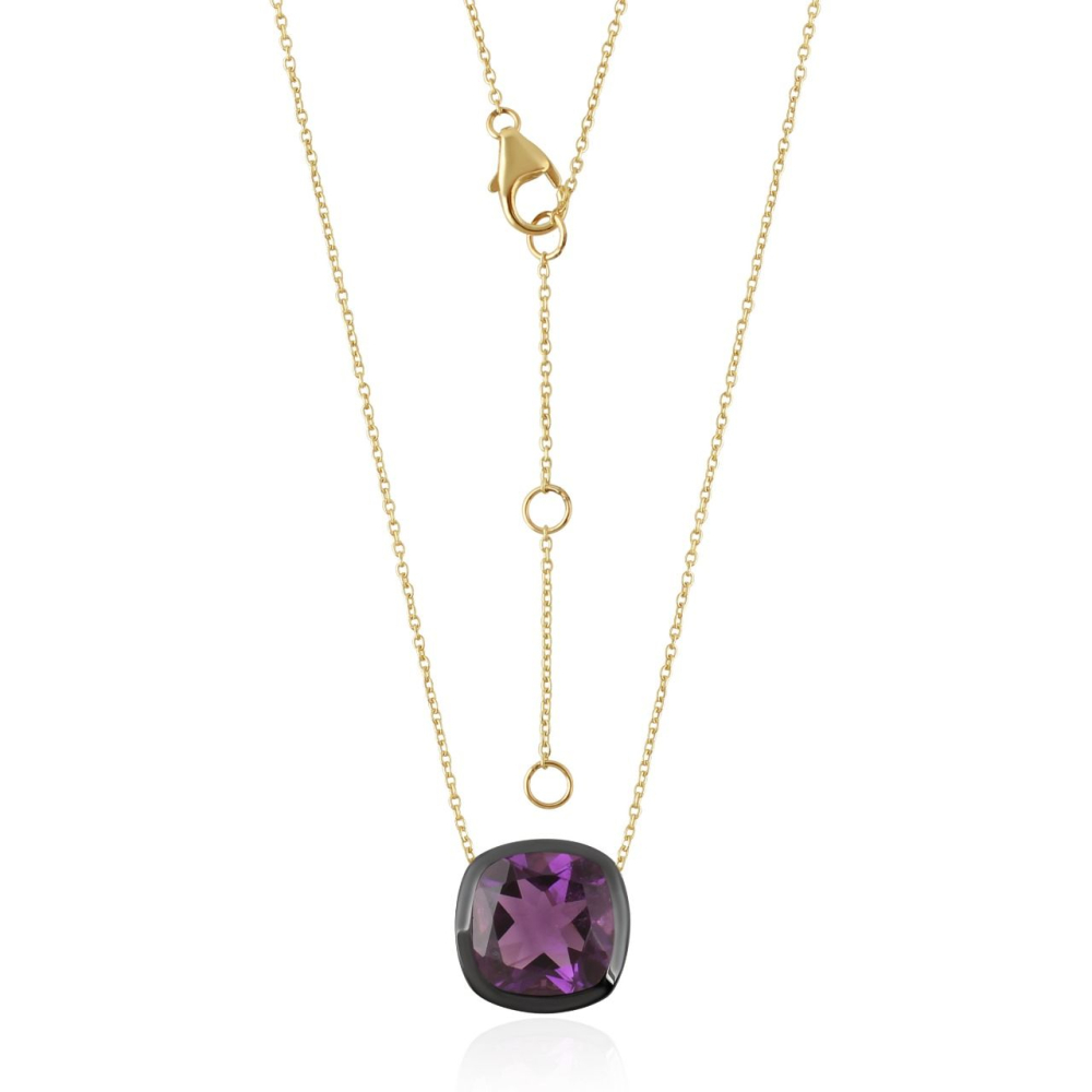 De 9 karaat gouden collier heeft een facet geslepen edelsteen. De vorm van de edelsteen is vierkant met een afmeting van 10 mm. Het collier heeft een verlengstuk en kan gesloten worden op een lengte van 38, 40 of 42 cm.