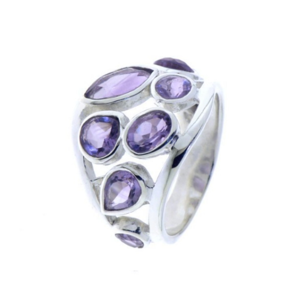 De zilveren ring heeft facet geslepen edelstenen. De edelstenen hebben verschillende vormen, rond, ovaal, druppel en marquise.