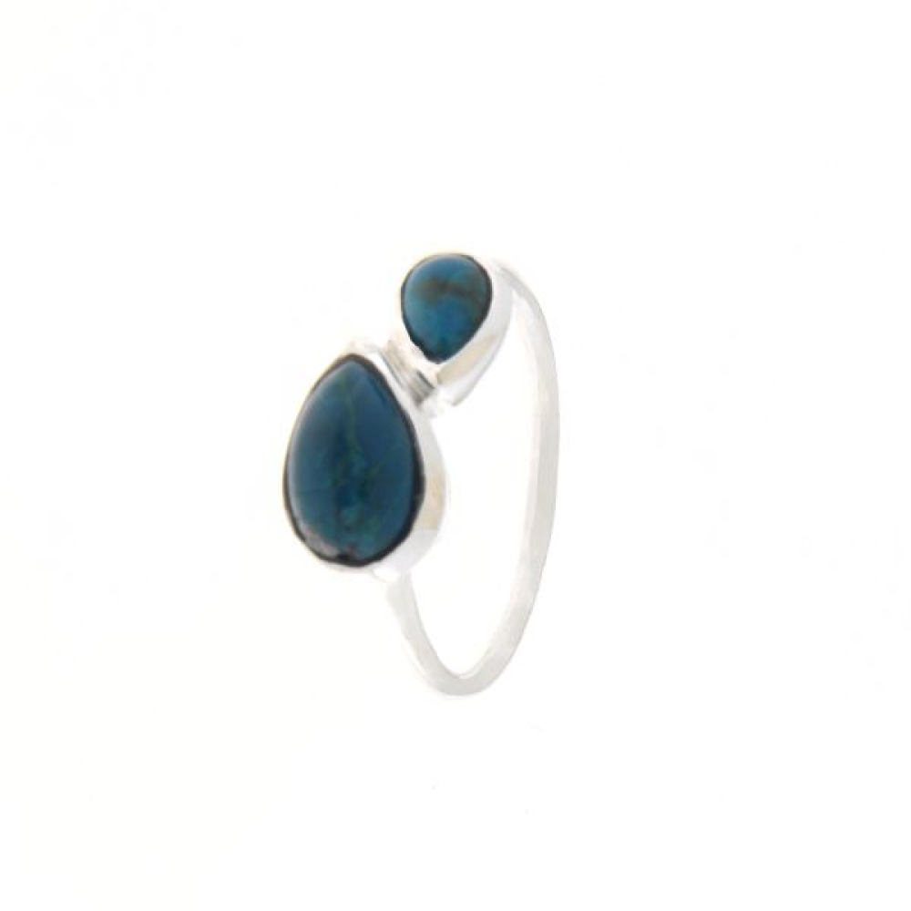 De zilveren ring heeft twee druppelvormige cabouchon geslepen edelstenen. De maten van de edelstenen zijn 9 x 7 mm en 6 x 4 mm.