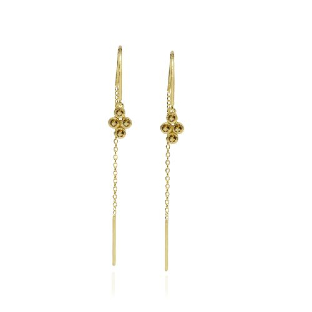 De goldplated doortrek oorhangers zijn gemaakt van 925 sterling zilver met facet geslepen edelstenen. De edelstenen zijn rond en hebben een afmeting van 3 mm. De oorhangers hebben een afmeting van 28 x 7 mm.