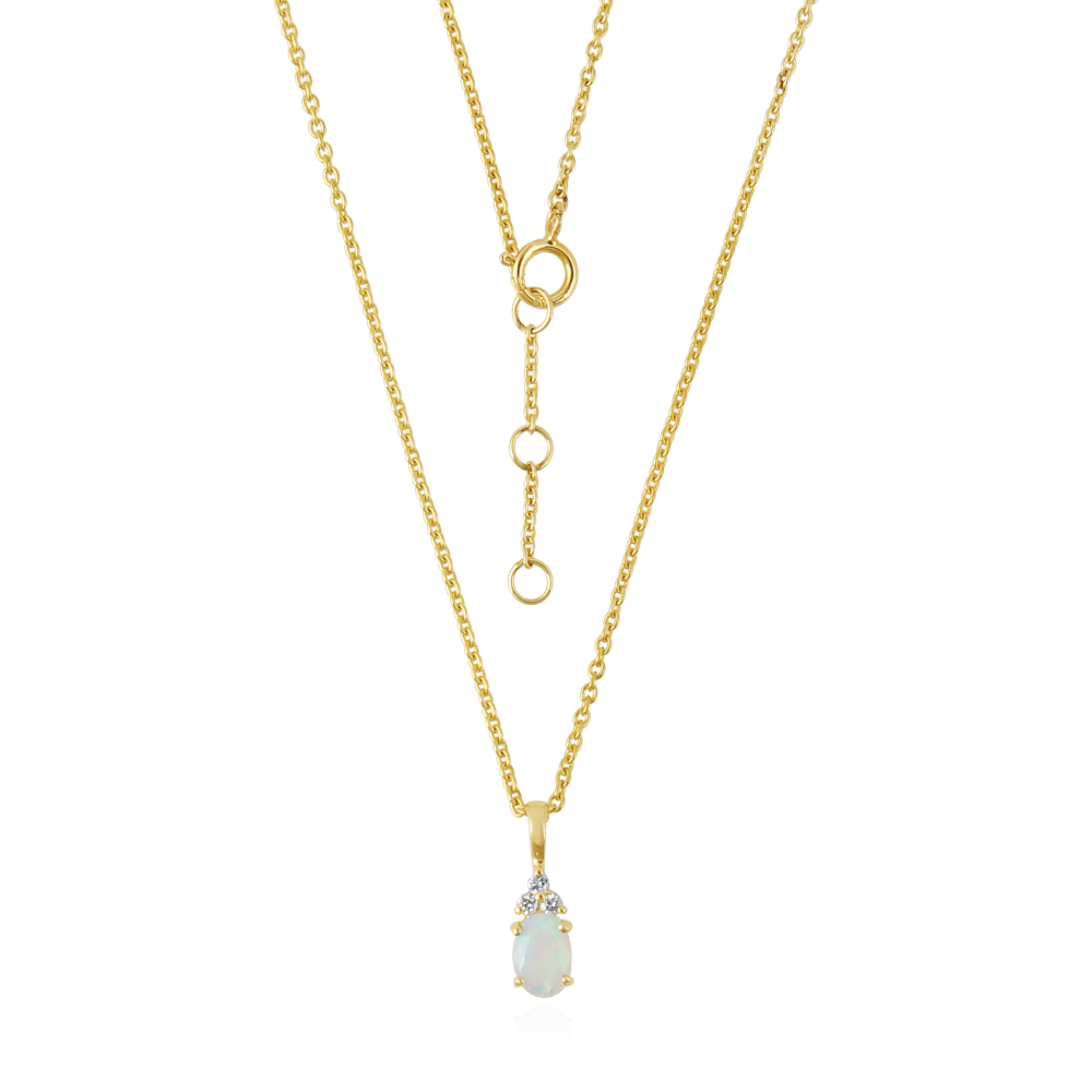 De 14 karaat gouden hanger heeft een facet geslepen edelsteen met 3 diamanten. De vorm van de edesteen is ovaal met een afmeting van 6 x 4 mm. Wordt geleverd met gouden ketting.