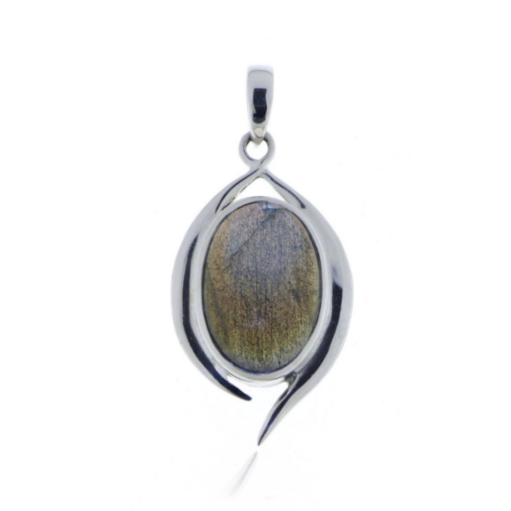 De zilveren hanger heeft een cabouchon geslepen edelsteen. De vorm van de edelsteen is ovaal met afmeting 18 bij 13 mm.