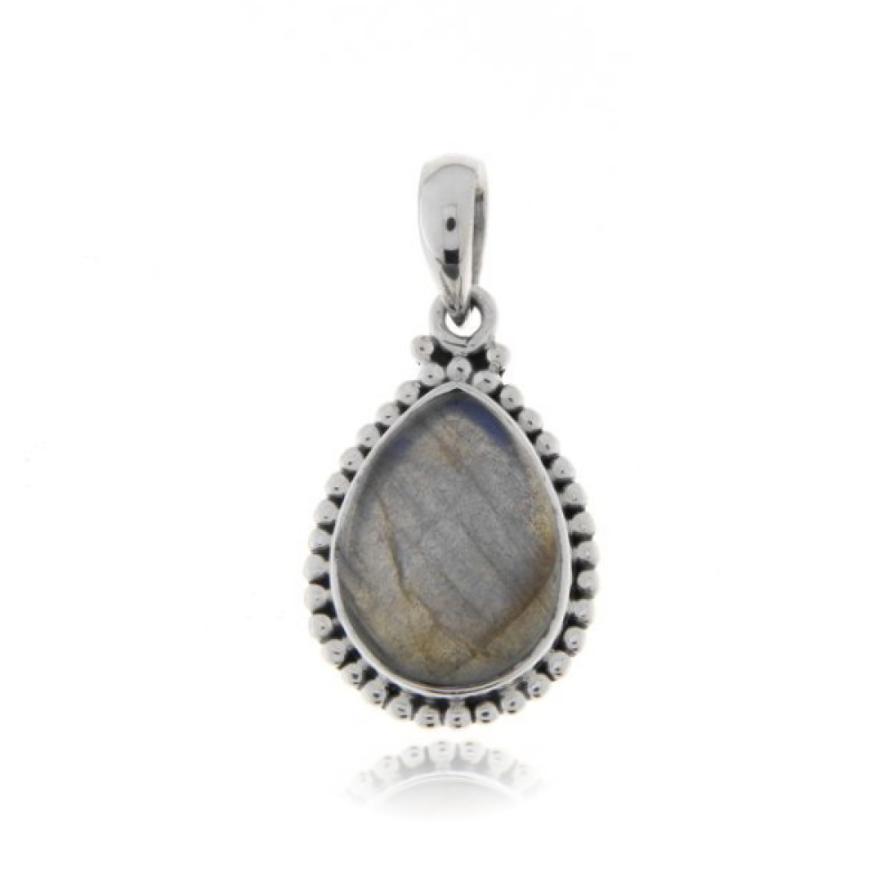 De zilveren hanger heeft een cabouchon geslepen edelsteen. De vorm van de edelsteen is druppelvormig met een afmeting van 16 bij 12mm.