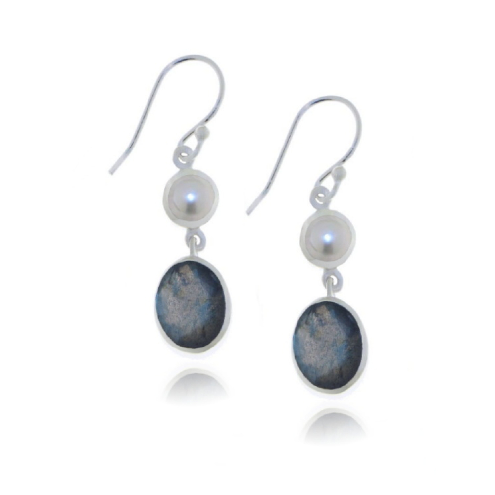 De zilveren oorhanger heeft een parel en een facet geslepen edelsteen. De afmeting van de parel is 6 mm, van de edelsteen 11 mm x 9 mm.