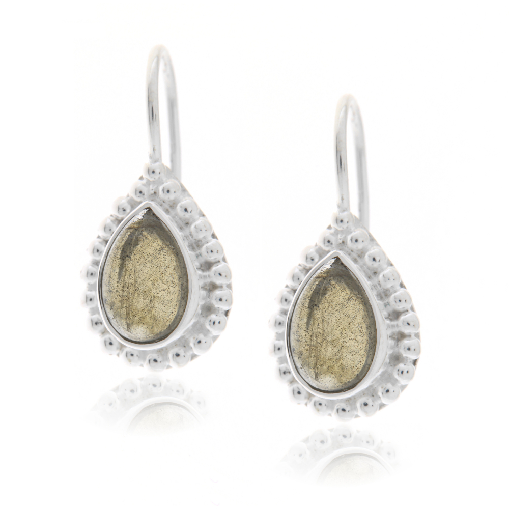 De zilveren oorhangers hebben cabouchon geslepen edelstenen. De vorm van de edelsteen is druppelvormig met een afmeting van 9 x 7 mm.