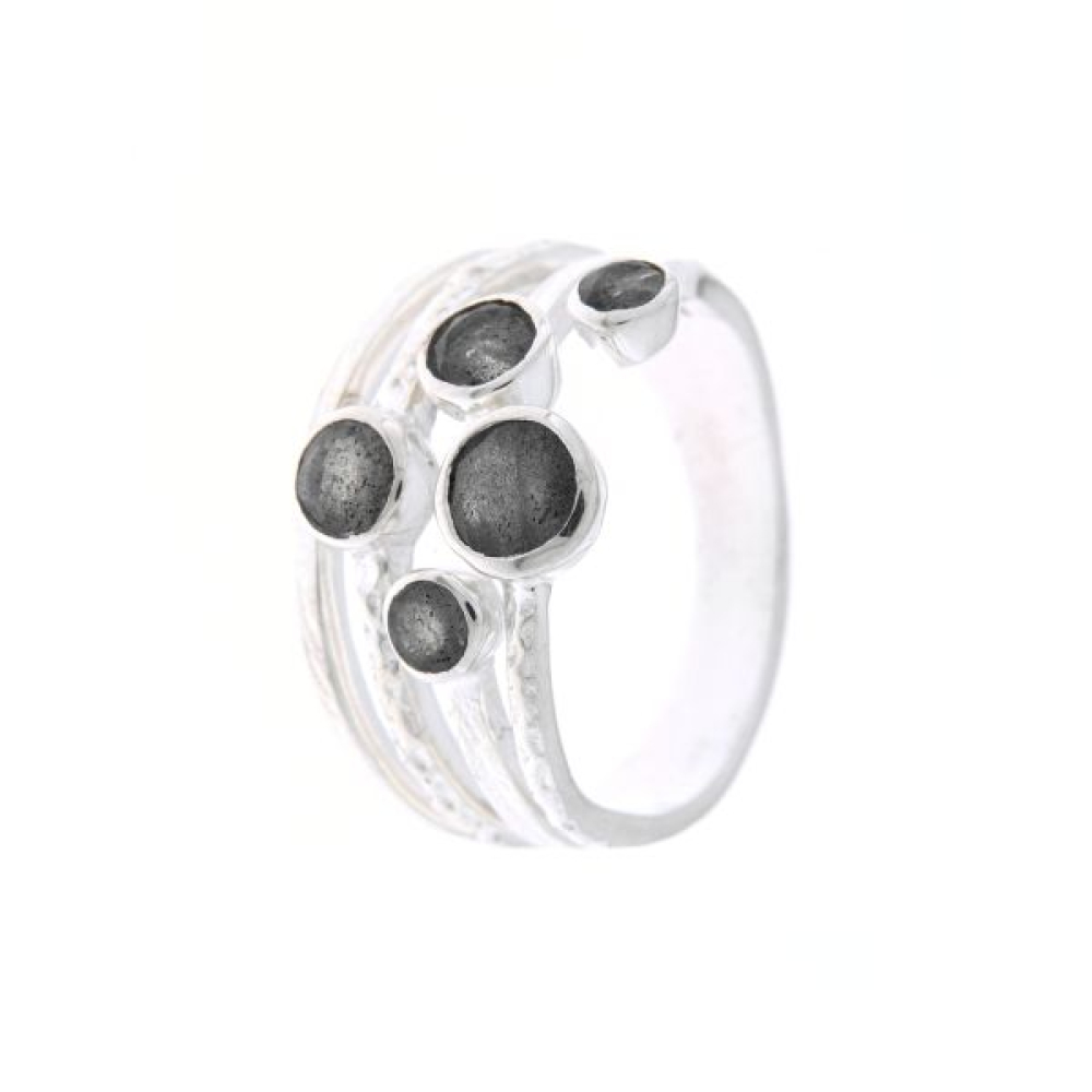 De zilveren ring heeft facet geslepen edelstenen. De vorm van de edelstenen zijn rond met een afmeting van 3, 4 en 5 mm.
