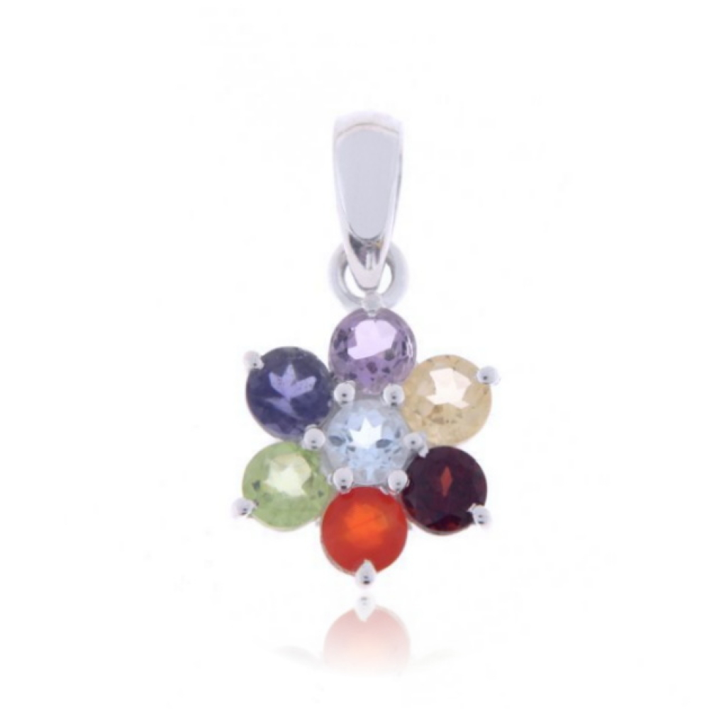 De zilveren hanger heeft facet geslepen edelstenen. De vorm van de edelstenen zijn rond met een afmeting van 3 mm. De volgende edelstenen zijn in de hanger gezet: Amethist, Ioliet, Blauwe Topaas, Peridoot, Citrien, Carneool en Granaat.