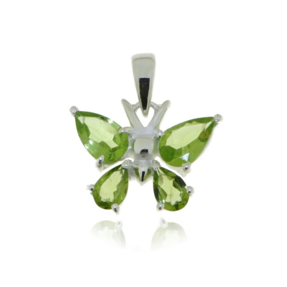 De zilveren vlinder hanger heeft facet geslepen edelstenen. De edelstenen zijn druppelvormig en hebben verschillende afmetingen van 8 bij 6 en 6 bij 4 mm.