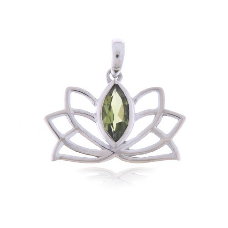 De zilveren lotusbloem hanger heeft een facet geslepen edelsteen. De vorm van de edelsteen is marquise vormig met een afmeting van 10 x 5 mm. In het Boeddhisme is de Lotus het symbool voor het inzicht dat tot verlichting leidt.