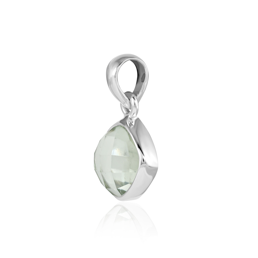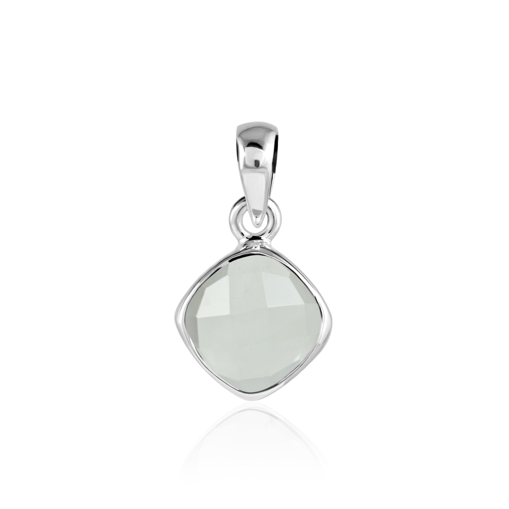 De zilveren hanger heeft een facet geslepen edelsteen. De vorm van de edelsteen is vierkant met afmeting van 10 x 10 mm.