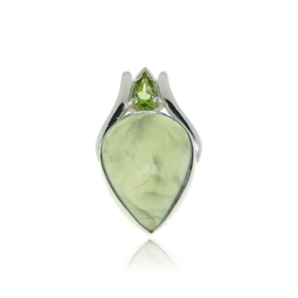 De zilveren hanger heeft een cabouchon geslepen edelsteen, met een facet geslepen Peridoot. De vorm van de edelsteen is druppelvormig met een afmeting van 17 bij 13 mm.