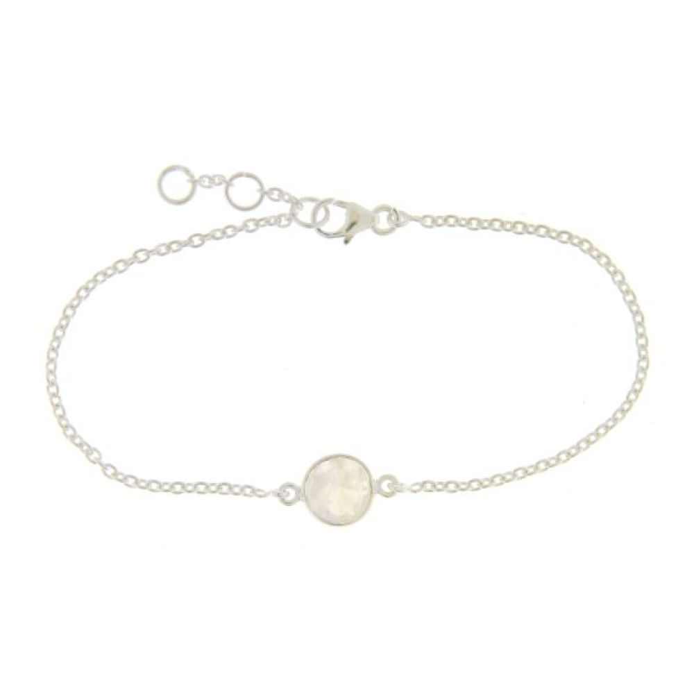 De zilveren armband heeft een facet geslepen edelsteen. De edelsteen is rond van vorm en heeft een afmeting van 8 mm. De armband heeft een verlengstuk van 3 cm en kan gesloten worden op een lengte van 17, 18 of 19 cm.