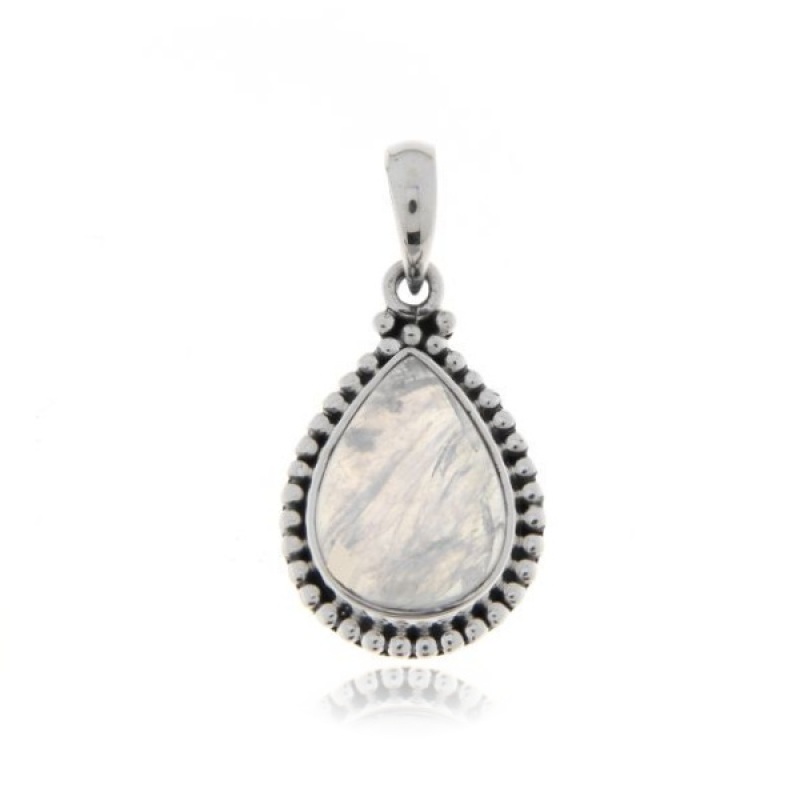 De zilveren hanger heeft een cabouchon geslepen edelsteen. De vorm van de edelsteen is druppelvormig met een afmeting van 16 bij 12mm.