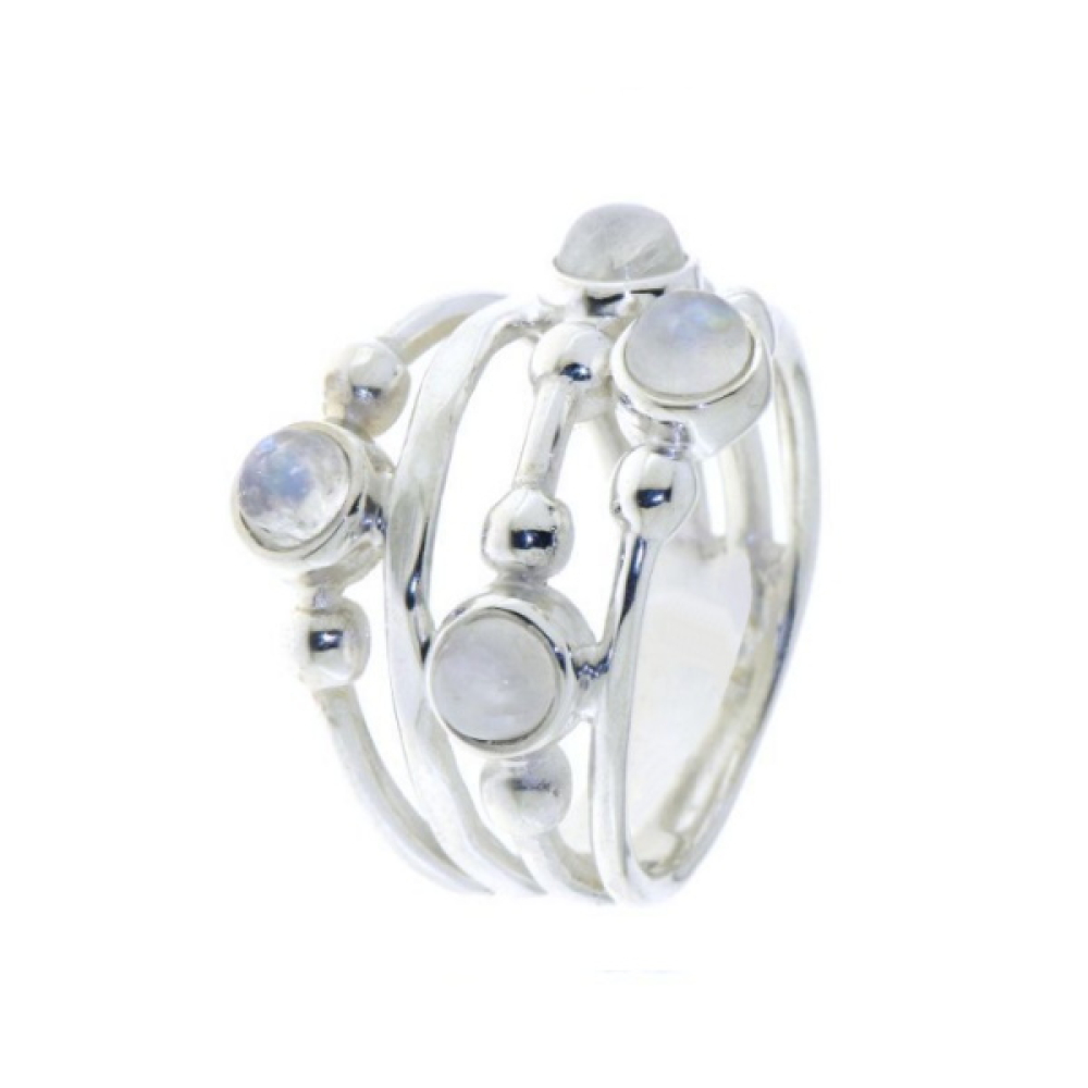 De zilveren ring heeft cabouchon geslepen edelstenen. De vorm van de edelstenen zijn rond met een afmeting van 4 mm.