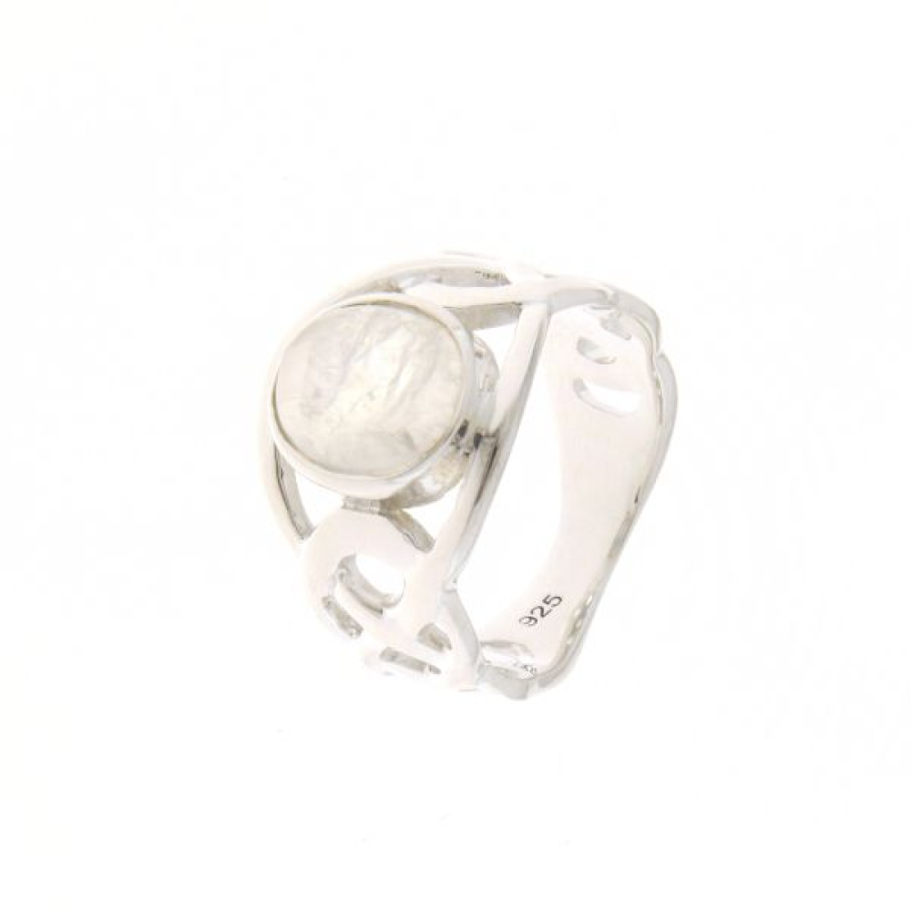 De zilveren ring heeft een facet geslepen edelsteen. De vorm van de edelsteen is onregelmatig met een afmeting van ongeveer 10 x 8mm.