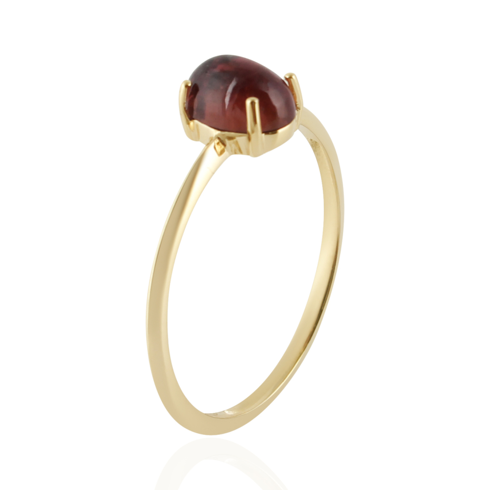De 14 karaat gouden ring heeft een cabouchon geslepen edelsteen. De vorm van de edesteen is ovaal met een afmeting van 7 x 5 mm.