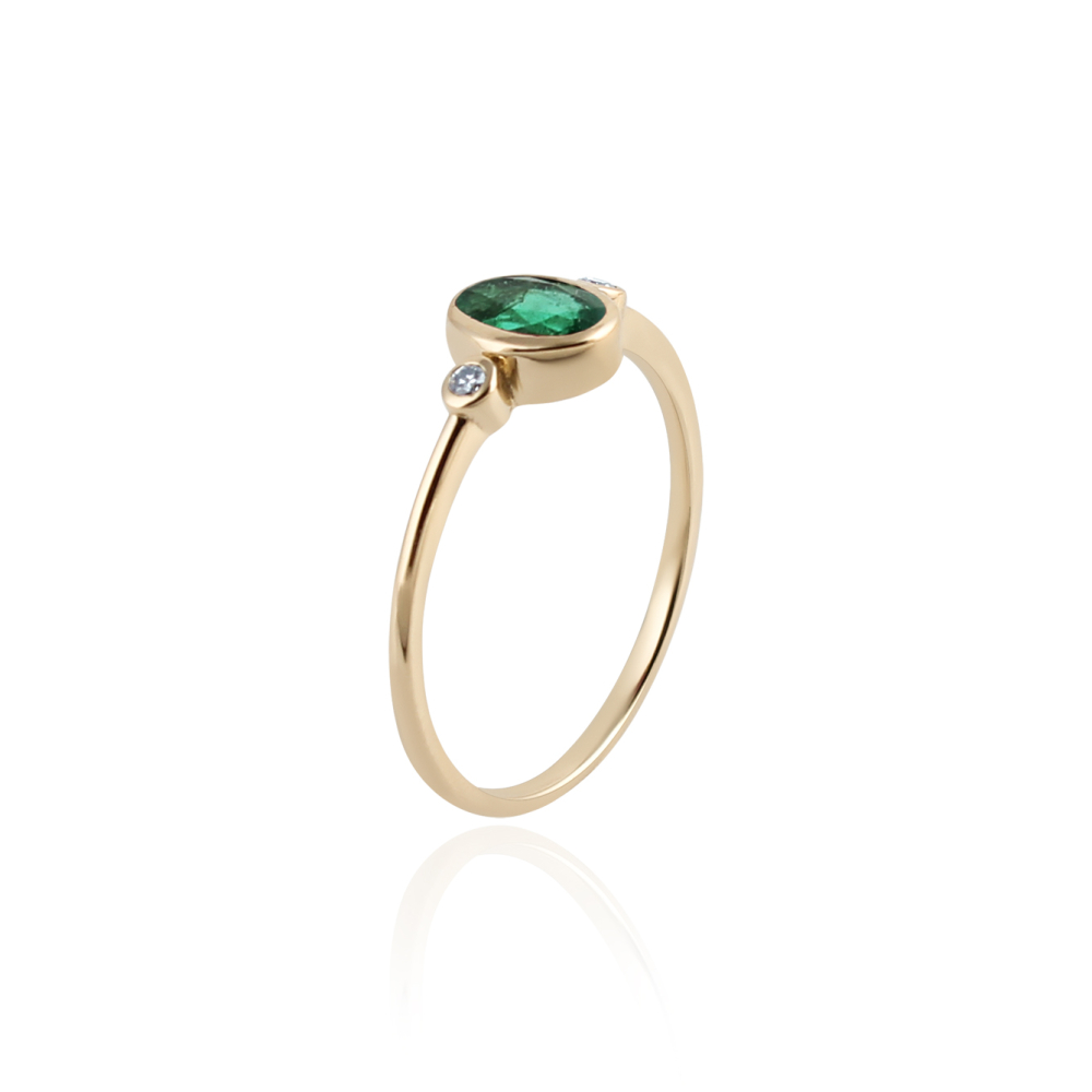 De 14 karaat gouden ring heeft een facet geslepen edelsteen met aan weerszijde een diamand. De vorm van de edesteen is ovaal met een afmeting van 6 x 4 mm.
