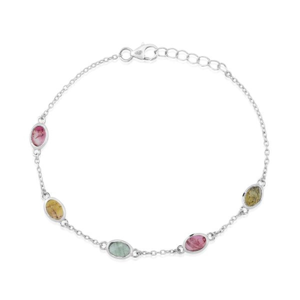 De zilveren armband heeft cabouchon geslepen edelstenen. De edelstenen zijn ovaal, de afmetingen zijn 6 x 4 mm. De armband heeft een verlengstuk van 3 cm en kan gesloten worden op een lengte van 17, 18 of 19 cm.