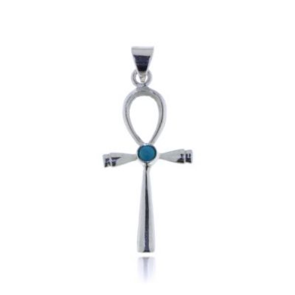 De zilveren ankh hanger heeft een cabouchon geslepen edelsteen. De vorm van de edelsteen is rond met een afmeting van 3 mm.